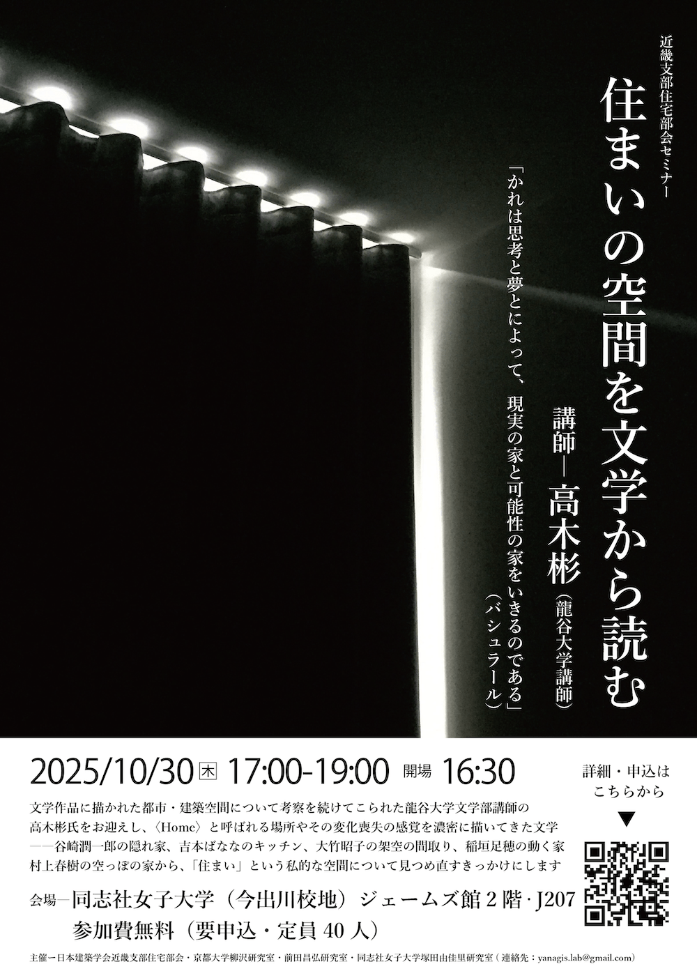 今回の住宅部会セミナーでは、文学作品に描かれた都市・建築空間について考察を続けてこられた、龍谷大学文学部講師の高木彬氏をお迎えし、〈Home〉と呼ばれる場所やその変化・喪失の感覚を濃密に描いてきた文学──谷崎潤一郎の隠れ家、吉本ばななのキッチン、大竹昭子の架空の間取り、稲垣足穂の動く家、村上春樹の空っぽの家──から、「住まい」という私的な空間について見つめ直すきっかけにしたいと思います。